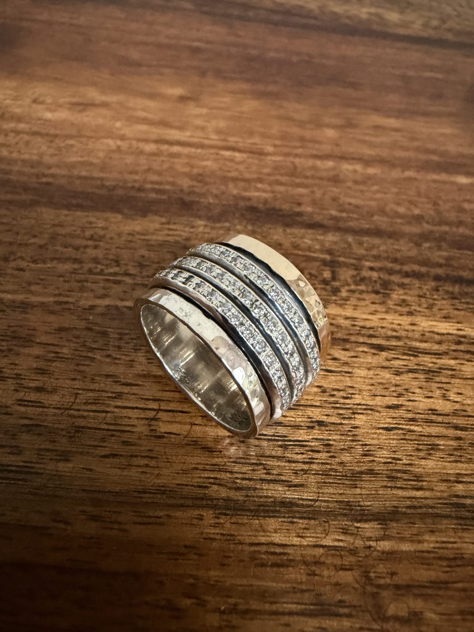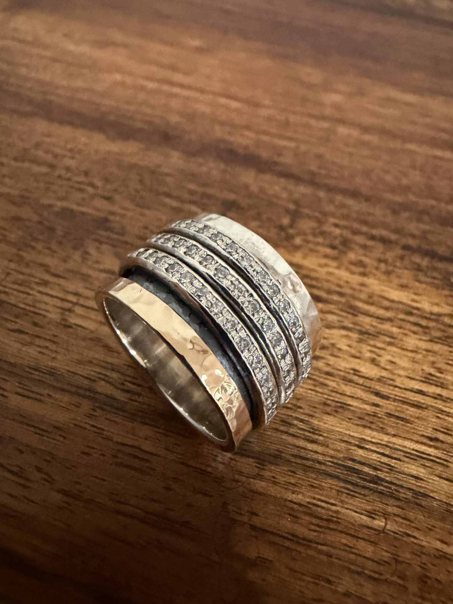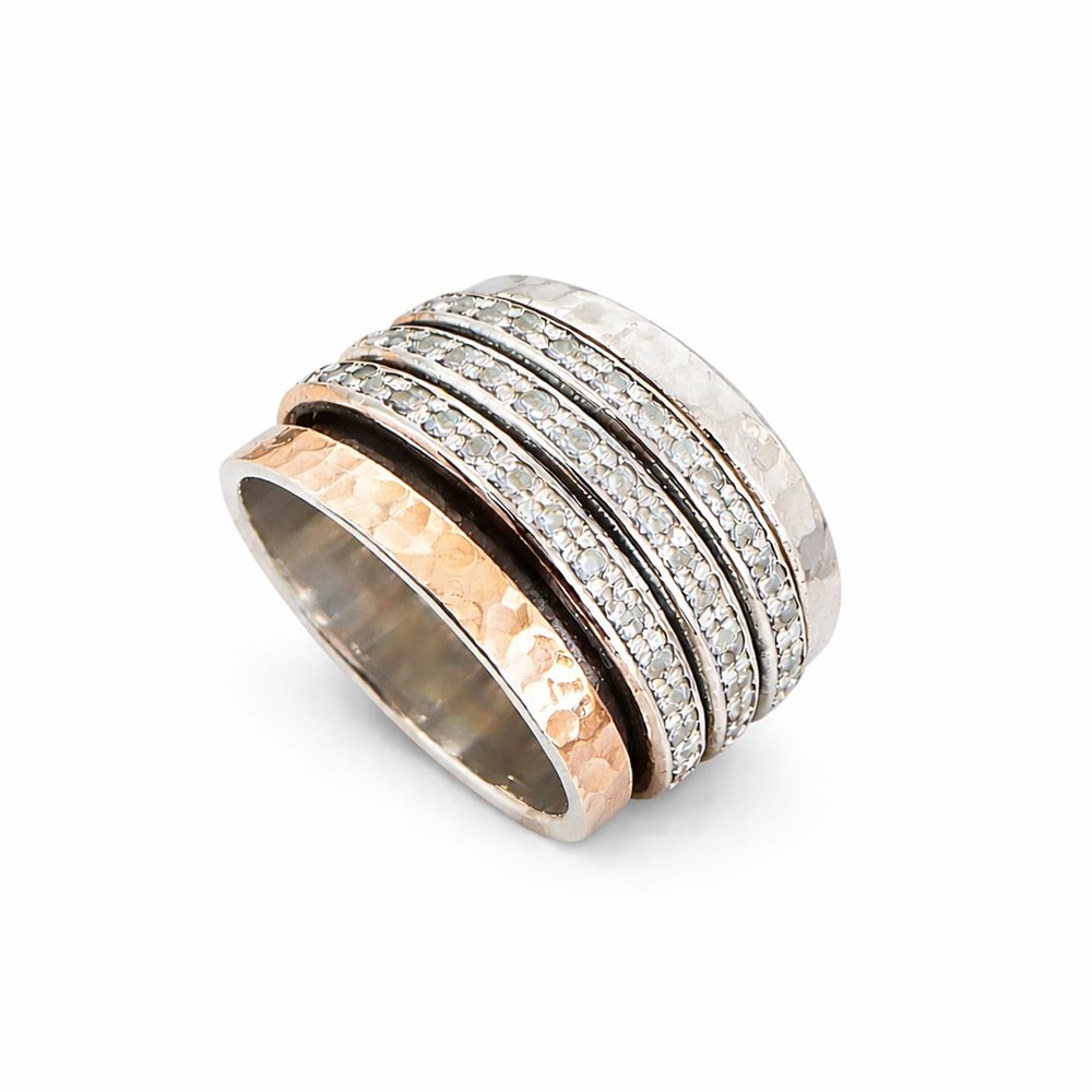 Designed with three rotating bands, the ring offers both visual movement and a smooth tactile experience. The gently spinning elements create a sense of balance and rhythm, while the shimmering stones reflect light from every angle, adding depth and dimension to the overall look.